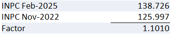 Factor de actualización = INPC de noviembre 2022 / INPC de febrero 2025