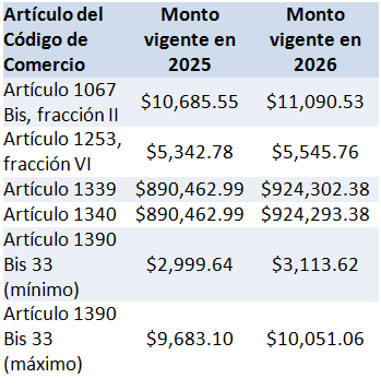Con fecha 17 de diciembre de 2025 se publica en el Diario Oficial de la Federación el por el que se da a conocer la actualización de los montos establecidos en los Artículos 1067 Bis Fracción II, 1253 Fracción VI, 1339, 1340 y 1390 Bis 33 del Código de Comercio, el cual entra en vigor el 1 de enero de 2026.